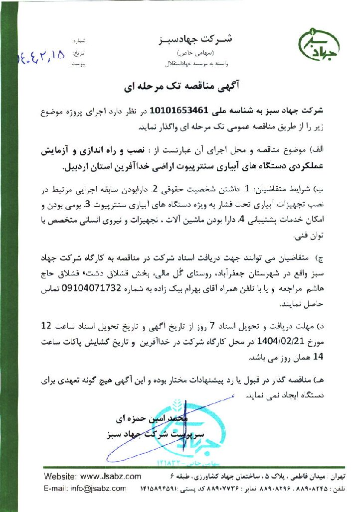 شركت جهاد سبز با پشتوانه تجارب چندين ساله، وجود متخصصين رشته های مختلف، دارا بودن امكانات وسيع از جمله ماشين آلات سنگين و نيمه سنگين، كارخانه های منحصر بفرد و جاری، فراوری و بسته بندی بذر و ايستگاههای توليد بذر و نهال متناسب با شرايط آب و هوايی هر منطقه قادر به طراحی و اجرای طرحهای مختلف منابع طبيعی، محيط زيست، كشاورزی و دامداری با كيفيت مطلوب می باشد.