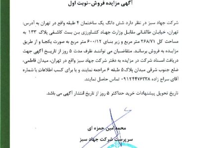 آگهی مزایده فروش- نوبت اول (شش دانک یک ساختمان 4 طبقه) تاریخ پیشنهادات خرید حداکثر 5 روز از تاریخ انتشار ...