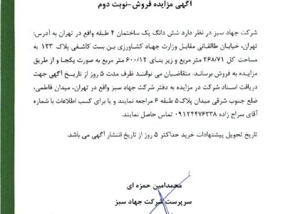 آگهی مزایده فروش- نوبت اول (شش دانک یک ساختمان 4 طبقه)